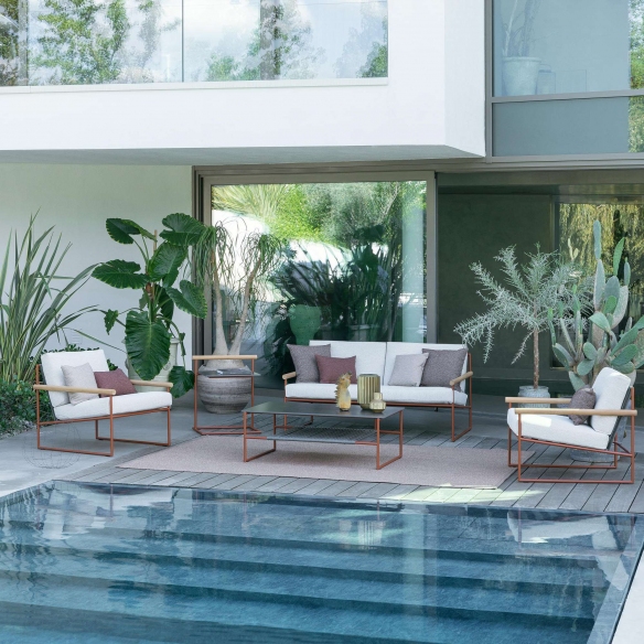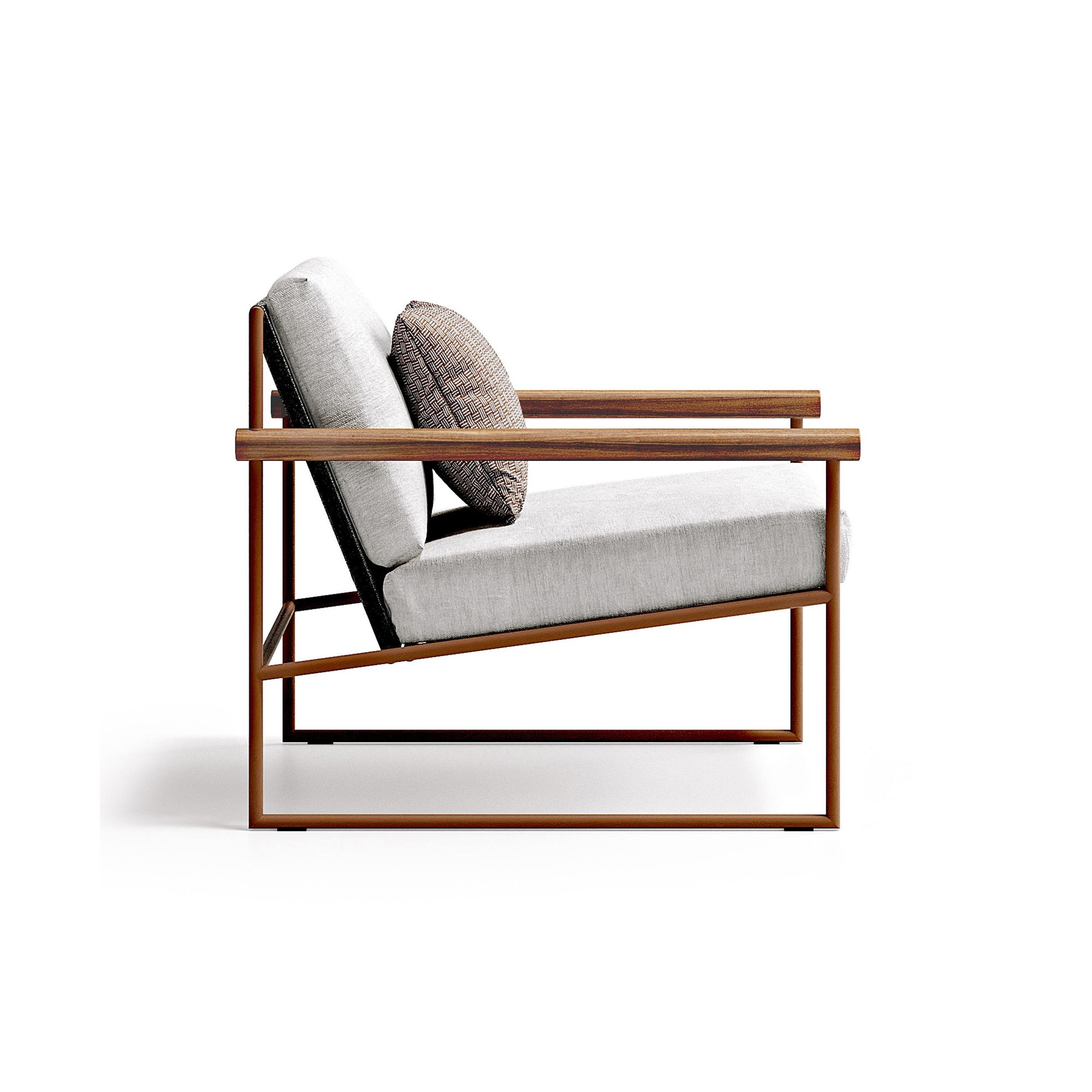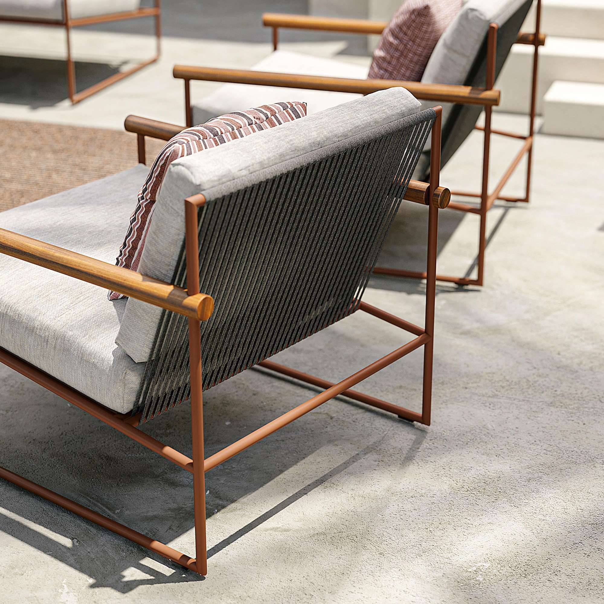 Poltrona da esterno Pipe realizzata con struttura in acciaio verniciato color terracotta, braccioli in teak, schienale in corda intrecciata a mano e cuscini della seduta e dello schienale rivestiti in tessuto outdoor. Disponibile in vari tessuti e colori, la poltrona outdoor Pipe si distingue per il suo design minimale, un incontro perfetto tra stile e comfort. La struttura slanciata è impreziosita e riscaldata dalla presenza del caratteristico bracciolo cilindrico in legno di teak, che funge da elemento distintivo e fil rouge dell'intera collezione. L'intreccio di corde che forma lo schienale non solo aggiunge un tocco di eleganza visiva, ma è anche progettato per sostenere comodamente i cuscini, garantendo un confort senza pari. Questa poltrona è l'ideale per chi cerca un pezzo d'arredo da esterno che unisca l'estetica pulita e contemporanea al calore e alla naturalezza dei materiali, senza rinunciare alla funzionalità e al comfort. La Pipe è la scelta ottimale per arricchire spazi esterni, come giardini, terrazze o bordi piscina, con un tocco di sofisticata semplicità. Ogni dettaglio è studiato per offrire una resistenza duratura agli agenti atmosferici, rendendo la poltrona da esterno Pipe un investimento di lungo termine per chi desidera vivere gli spazi aperti in pieno relax e con stile. Disegnata da Busetti Garuti Redaelli per Atmosphera.