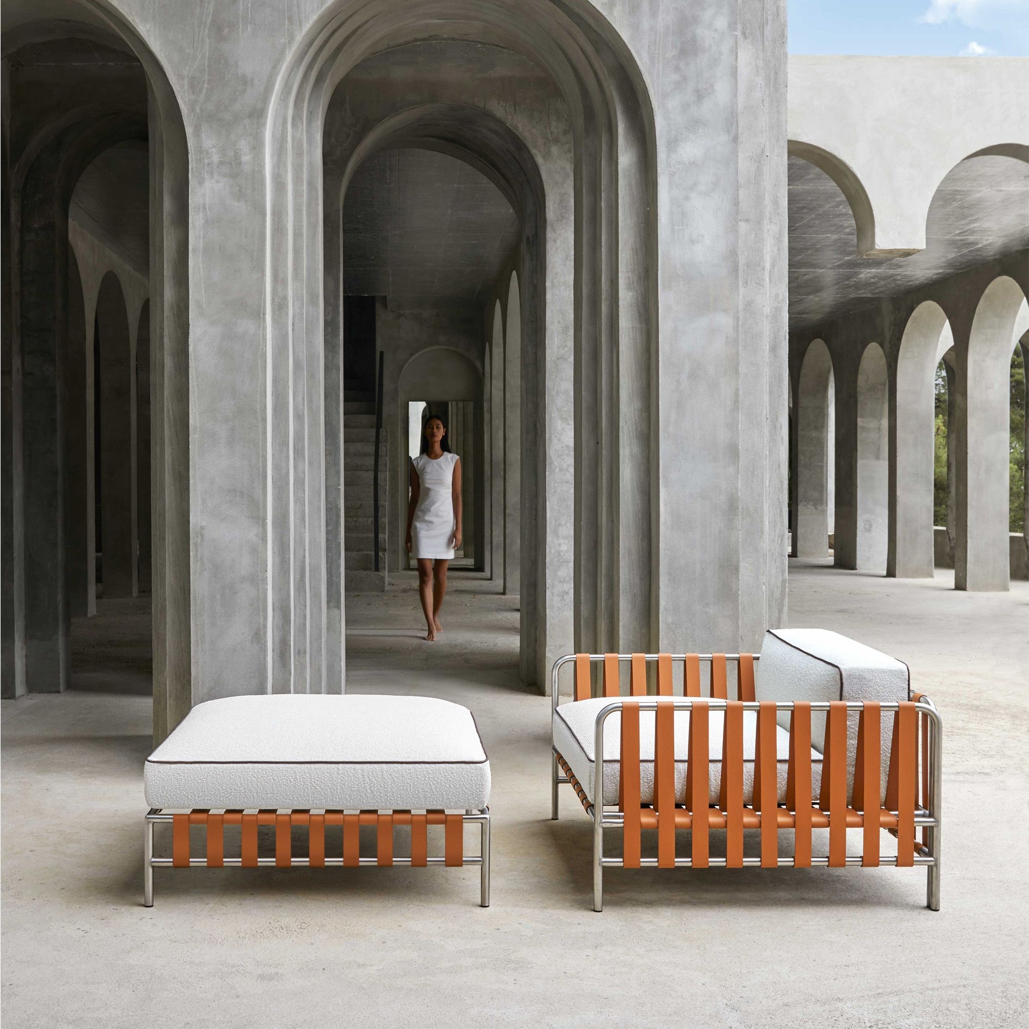Pouf modulare Onsen con struttura in acciaio inox AISI 316L satinato a basso contenuto di carbonio e resistente alla corrosione e all'ossidazione, cinturini in pelle sintetica, vinile e poliestere, cordoncino in tessuto 100% acrilico, cuscino di seduta con imbottitura in gomma poliuretanica espansa rivestita in tessuto idrorepellente e perfetto come poggiapiedi o come una comoda seduta da collocare negli spazi outdoor di un giardino o di un terrazzo soleggiato. Disegnato da Francesco Meda e David Quincoces per Gandía Blasco.