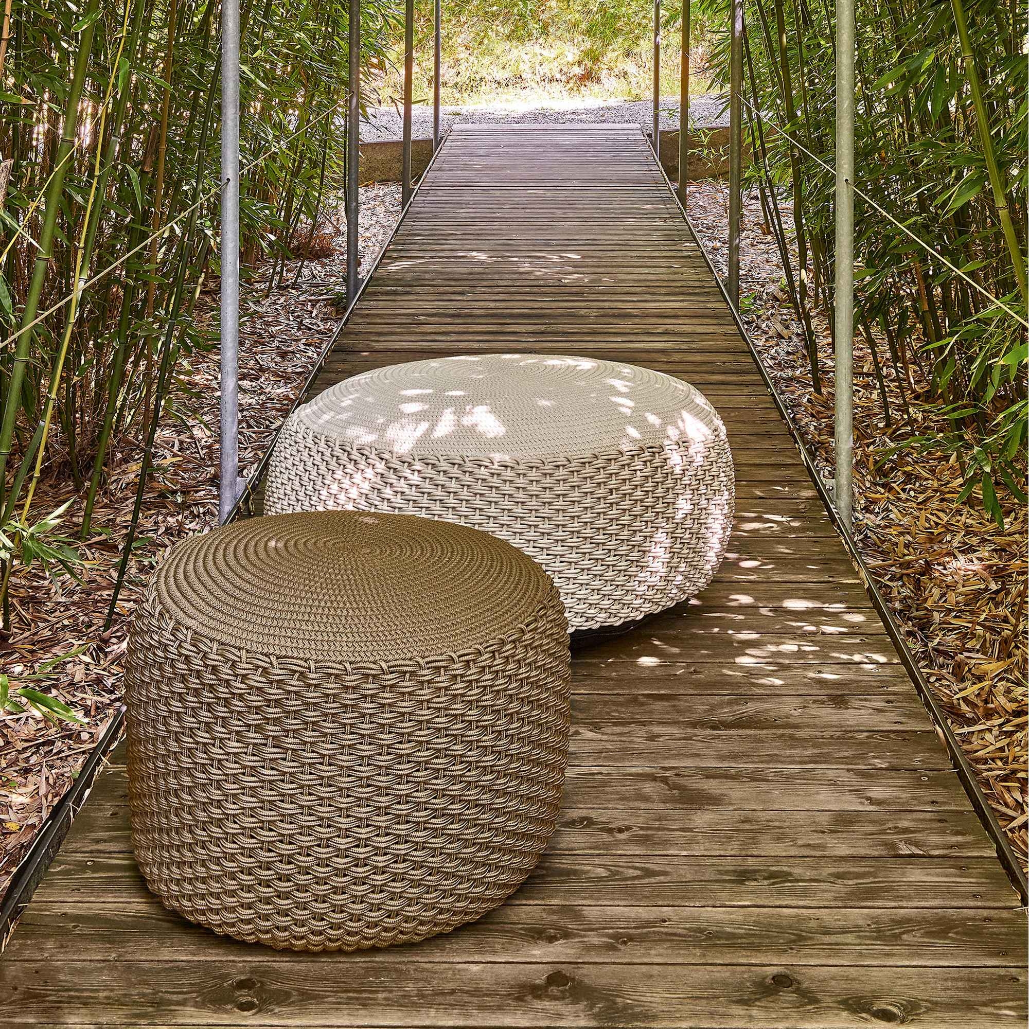 Pouf da esterno misura small (Ø55x50h cm) realizzato in polipropilene cucito a mano. Disponibile in 2 colorazioni, questo pouf è una soluzione di seduta innovativa ed elegante, adatto ad arricchire qualsiasi ambiente, sia indoor che outdoor. Questo versatile complemento d'arredo si presenta come un'alternativa creativa a sedie e sgabelli, offrendo una seduta flessibile o uno spazio confortevole dove posizionare i piedi e rilassarsi. La sua intrecciatura è cucita a mano, un dettaglio che non solo testimonia l'alta artigianalità del prodotto, ma che garantisce anche un'impareggiabile resistenza alle intemperie. La qualità della fattura assicura che il pouf conservi inalterata la sua bellezza, nonostante l'esposizione agli elementi naturali. La sua struttura leggera e maneggevole lo rende facile da spostare, permettendoti di riorientare il tuo layout all'aperto in base ai gusti e alle necessità. Realizzato da Weishäupl.