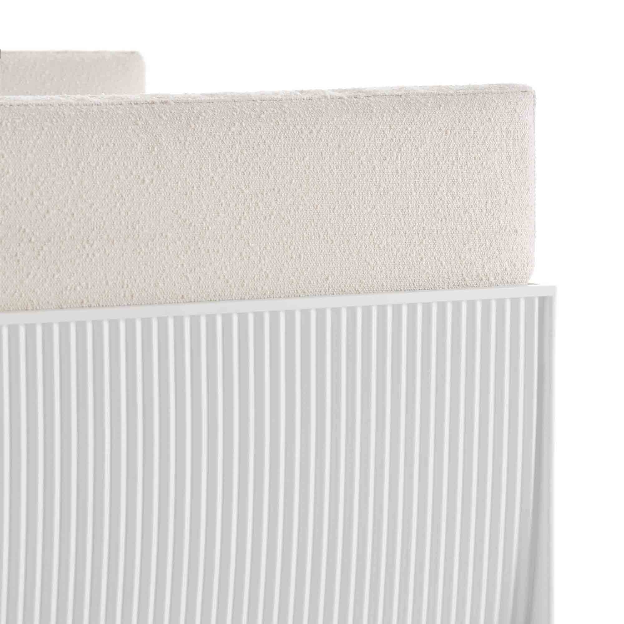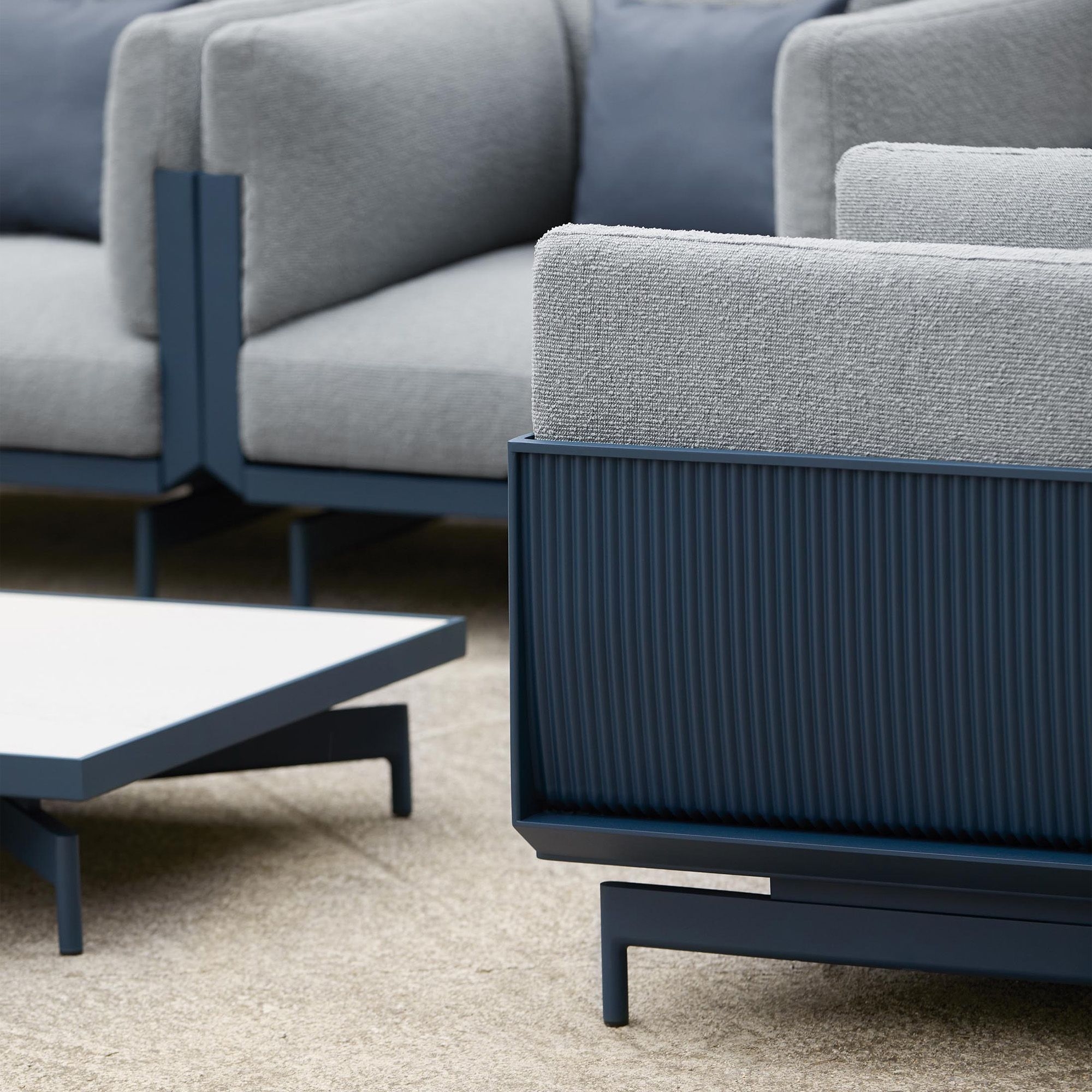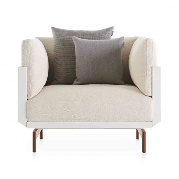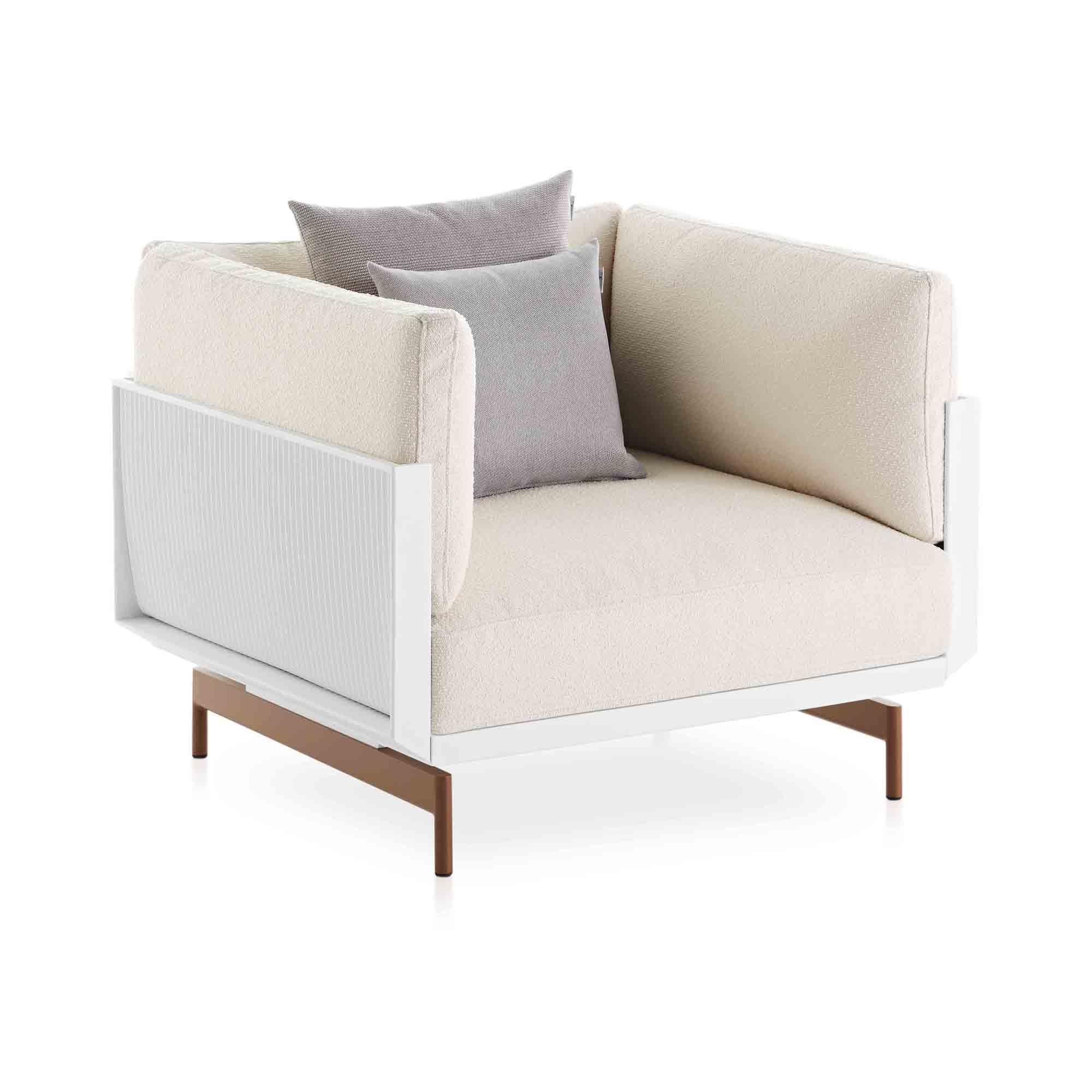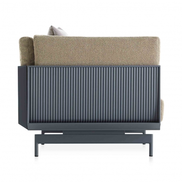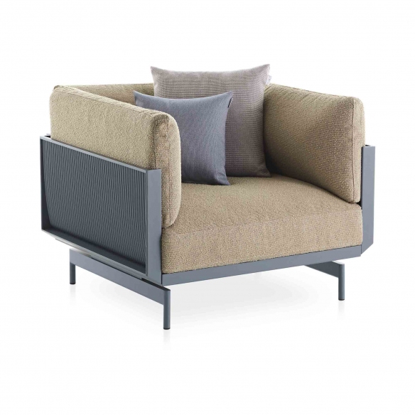 Poltrona lounge Onde con struttura in alluminio verniciato a polveri, schienale in lamiera ondulata in alluminio termolaccato, cuscini seduta, schienale e braccioli imbottiti in gomma poluiretanica espansa e rivestiti in tessuto idrorepellente di prima qualità ( Kvadrat, Sunbrella e Dedar Milano), un design deciso e accattivante, e comodo e accogliente e capace di collocarsi con facilità in moderni spazi esterni di un giardino o di un terrazzo. Disegnata Luca Nicchetto per Gandía Blasco.