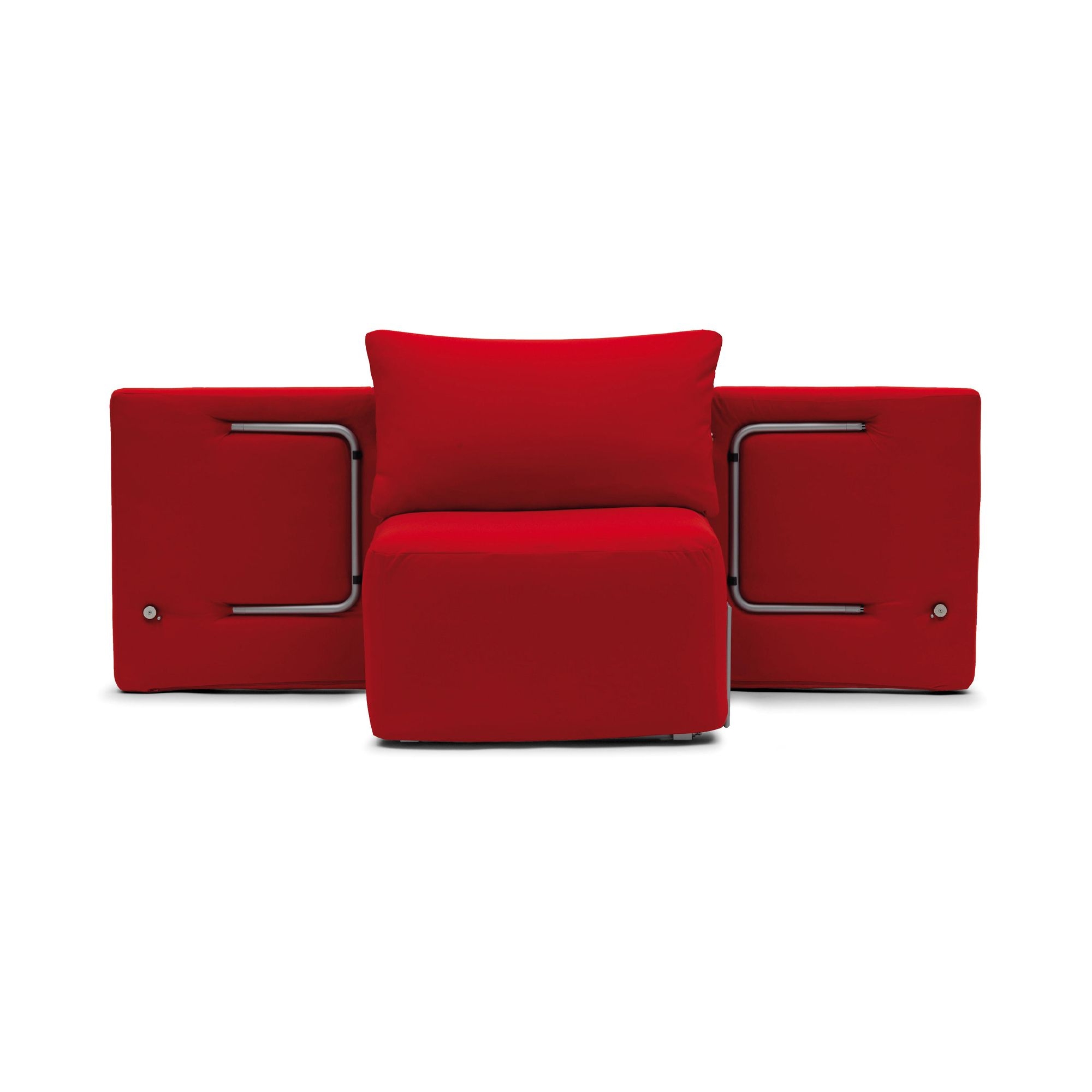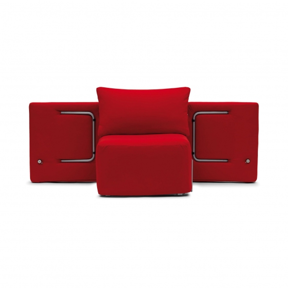 Poltrona con due letti singoli Oops realizzata con struttura in acciaio, imbottitura in poliuretano espanso e ovatta poliestere, rivestimento in Lycra colorata. Disponibile in 7 colori, la poltrona Oops si distingue nell'universo del design d'interni per l'estrema versatilità insita in forme sobrie e geometriche, nate dalla visione innovativa di Giulio Manzoni. Perfetto connubio di minimalismo formale e funzionalità pratica, Oops è molto più di una poltrona: è una soluzione trasformabile in grado di offrire una doppia configurazione come letto singolo completo di comodino, o come due letti singoli a pieno comfort. La sua natura compatta la rende ideale per spazi ridotti senza sacrificare l'esperienza di un autentico relax.Oops eccelle grazie alla sua base squadrata e all'imbottitura accogliente, proponendo un interior design che è allo stesso tempo presenza discreta e punto focale dell'ambiente. Che sia utilizzata come comfortevole poltrona con schienale e braccioli per i tuoi momenti di riposo quotidiano, un pratico pouf o trasformata in zona notte, la poltrona Oops incarna la massima espressione del concetto "Less is more".