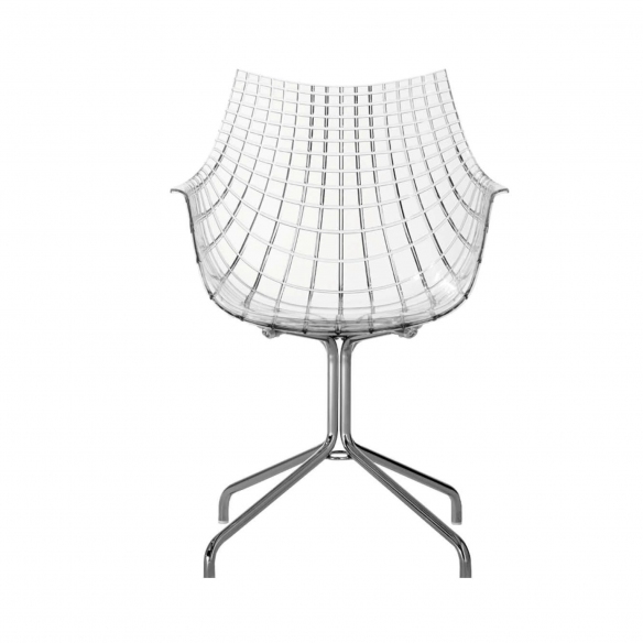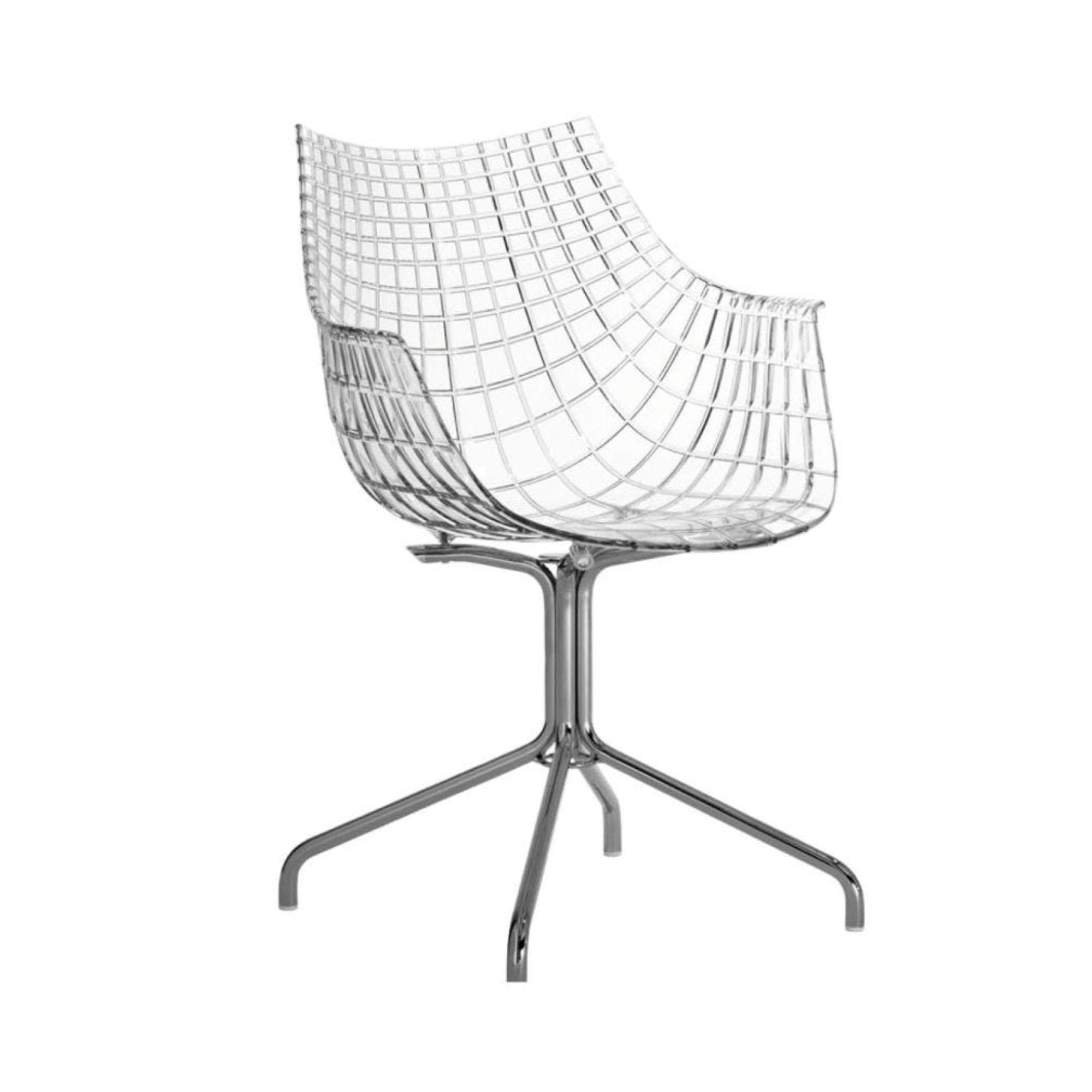 Poltroncina Meridiana, realizzata con seduta in policarbonato e struttura in acciaio cromato. Proposta qui con la seduta trasparente, Meridiana è una poltroncina molto elegante e versatile, ed è adattabile a qualsiasi ambiente domestico, dalla sala da pranzo all'ufficio. Il sedile prende ispirazione dalle linee del diamante, caratteristica che gli conferisce estrema preziosità. La poltroncina perfetta per gli amanti della suggestività applicata nei complementi d'arredo. Disegnata da Christophe Pillet per Driade.