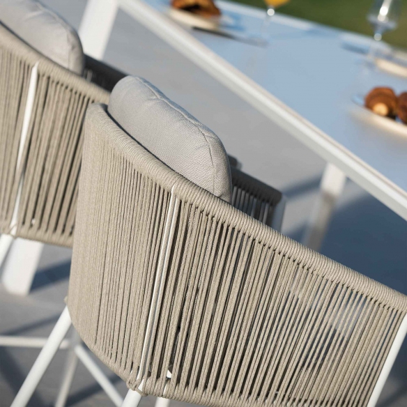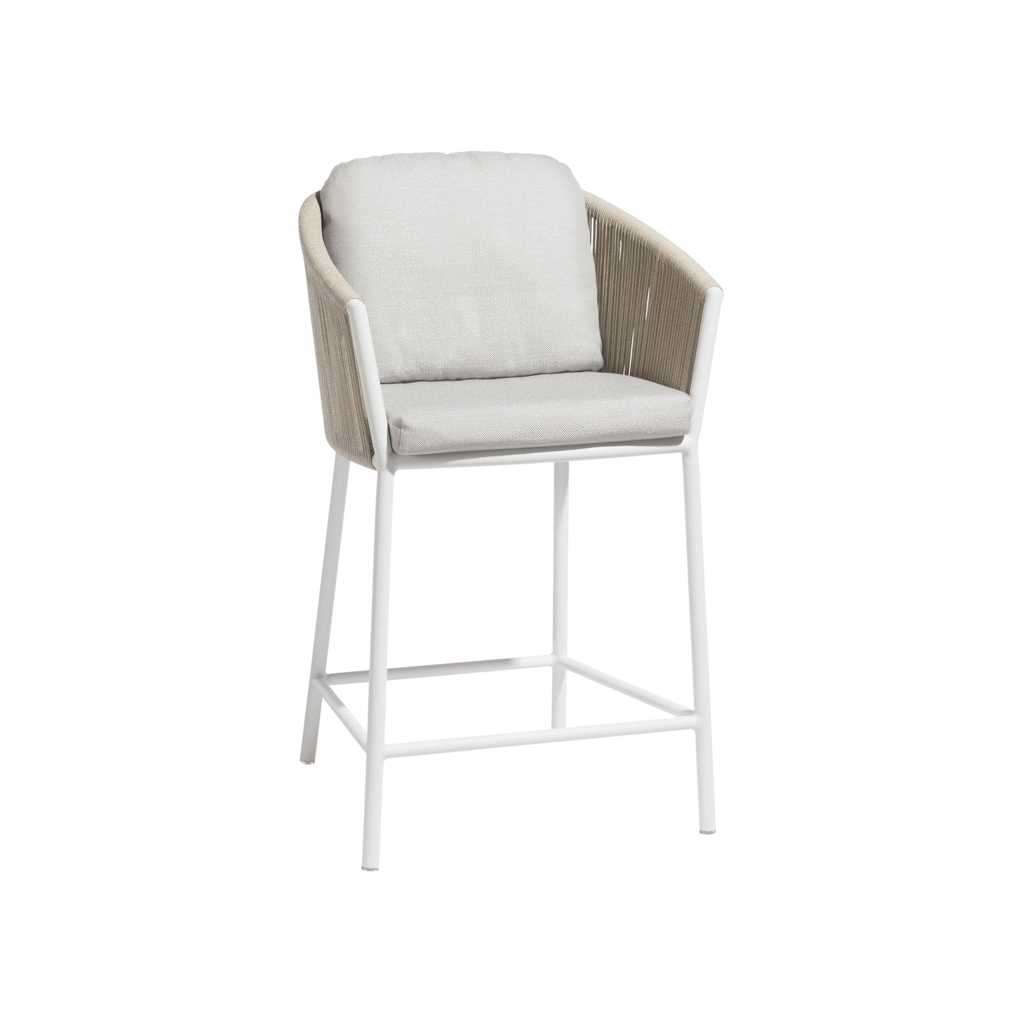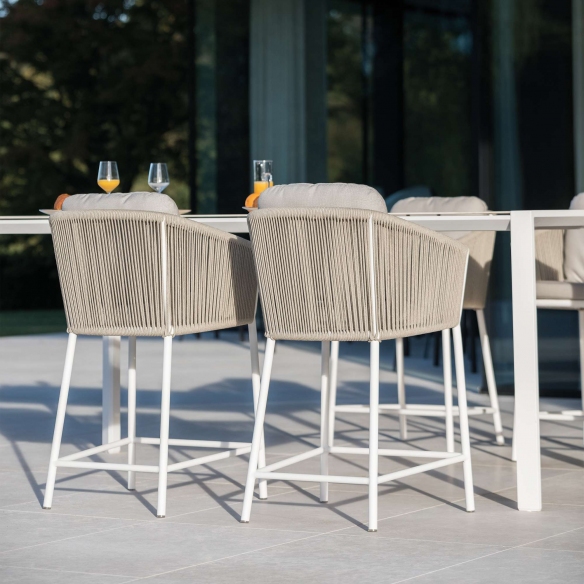 Sgabello bar Omer con altezza di 60,5 cm, realizzato da Diphano con materiali di alta qualità, combina il tessuto resistente ai vari agenti atmosferici come pioggia e raggi UV, la corda per lo schienale che regala un tocco di raffinatezza, e il metallo, offrendo una durabilità del prodotto ineguagliabile. Lo sgabello bar outdoor è disponibile in due meravigliose colorazioni e ha un design minimalista e delle linee pulite, in grado di adattarsi perfettamente a qualsiasi stile di decoro e arredamento, da un giardino più rustico o tradizionale, a un'ampia terrazza ultra-moderna. La seduta assicura il massimo relax anche durante un uso prolungato; il poggiapiedi integrato, invece, offre un ulteriore supporto, rendendo lo sgabello Omer il perfetto accompagnamento sia per i momenti di relax in solitudine che per momenti conviviali con amici e parenti. Un dettaglio particolare di questo sgabello outdoor è proprio la rifinitura in corda dello schienale, che regala comodità ed eleganza. Che si tratti di arricchire l'ambiente di un bar, un giardino o un patio, lo sgabello Omer 60,5 cm si distingue per la sua capacità indiscussa di unire bellezza, funzionalità e innovazione.