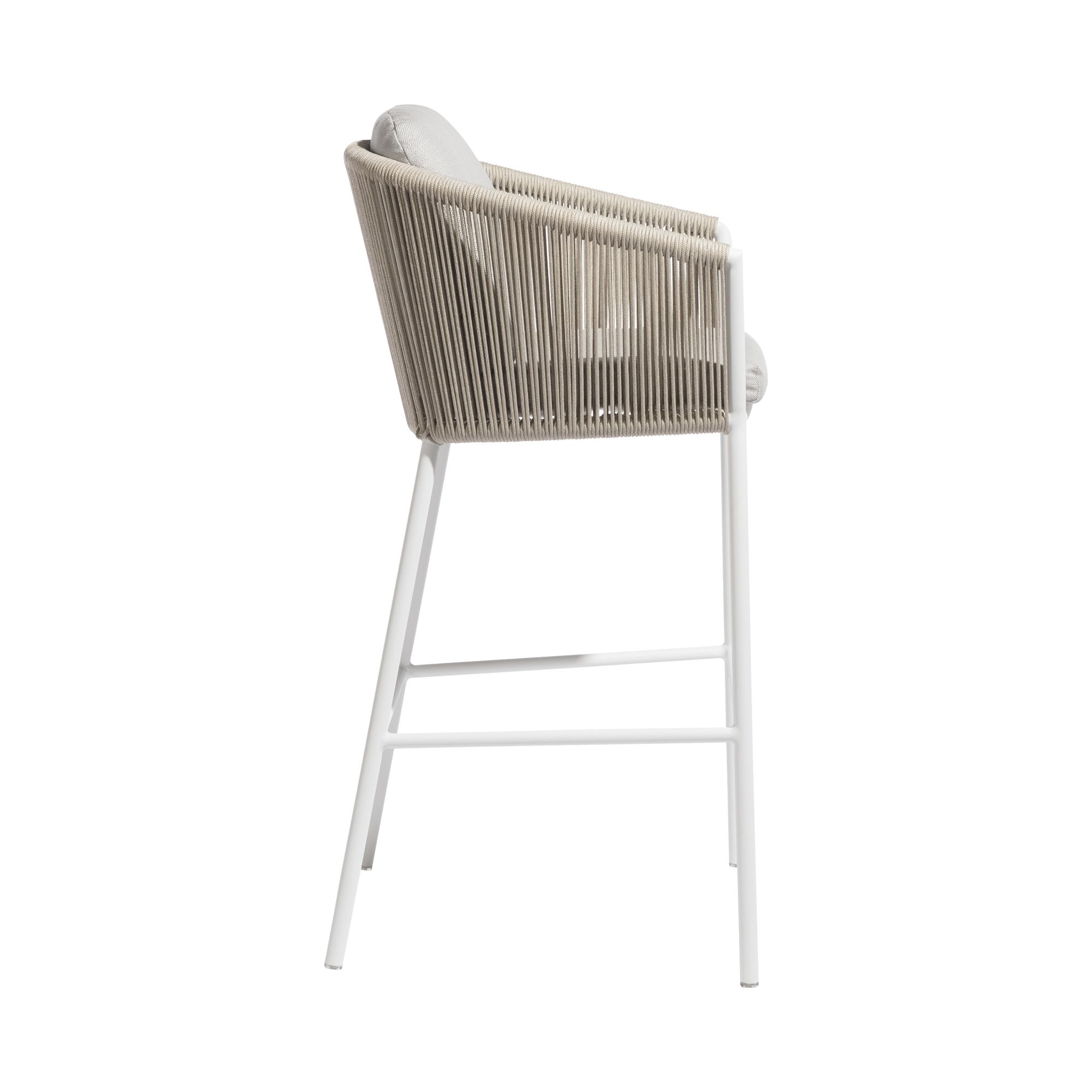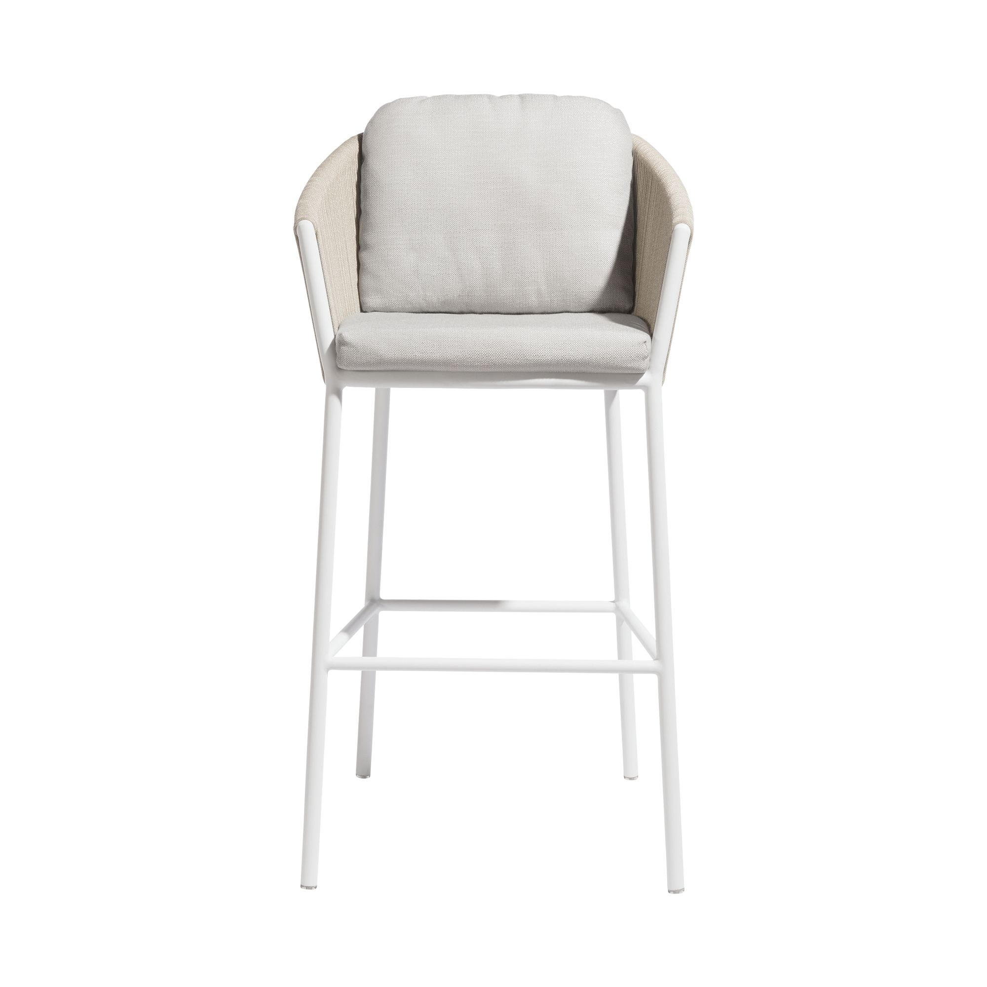 Sgabello bar Omer con altezza di 77,5 cm e cuscini integrati, realizzato da Diphano con materiali di alta qualità, combina il tessuto resistente ai vari agenti atmosferici come pioggia e raggi UV, la corda per lo schienale che regala un tocco di raffinatezza, e il metallo, offrendo una durabilità del prodotto ineguagliabile. Lo sgabello bar outdoor è disponibile in due meravigliose colorazioni e ha un design minimalista e delle linee pulite, in grado di adattarsi perfettamente a qualsiasi stile di decoro e arredamento, da un giardino più rustico o tradizionale, a un'ampia terrazza ultra-moderna. Lo sgabello offre una comodità senza limiti grazie ai suoi cuscini integrati, rivestiti in tessuto resistente ai cambiamenti climatici che lo rendono ideale per l'uso esterno. La seduta assicura il massimo relax anche durante un uso prolungato; il poggiapiedi integrato, invece, offre un ulteriore supporto, rendendo lo sgabello Omer il perfetto accompagnamento sia per i momenti di relax in solitudine che per momenti conviviali con amici e parenti. Un dettaglio particolare di questo sgabello outdoor è proprio la rifinitura in corda dello schienale, che regala comodità ed eleganza. Che si tratti di arricchire l'ambiente di un bar, un giardino o un patio, lo sgabello Omer 77,5 cm si distingue per la sua capacità indiscussa di unire bellezza, funzionalità e innovazione.