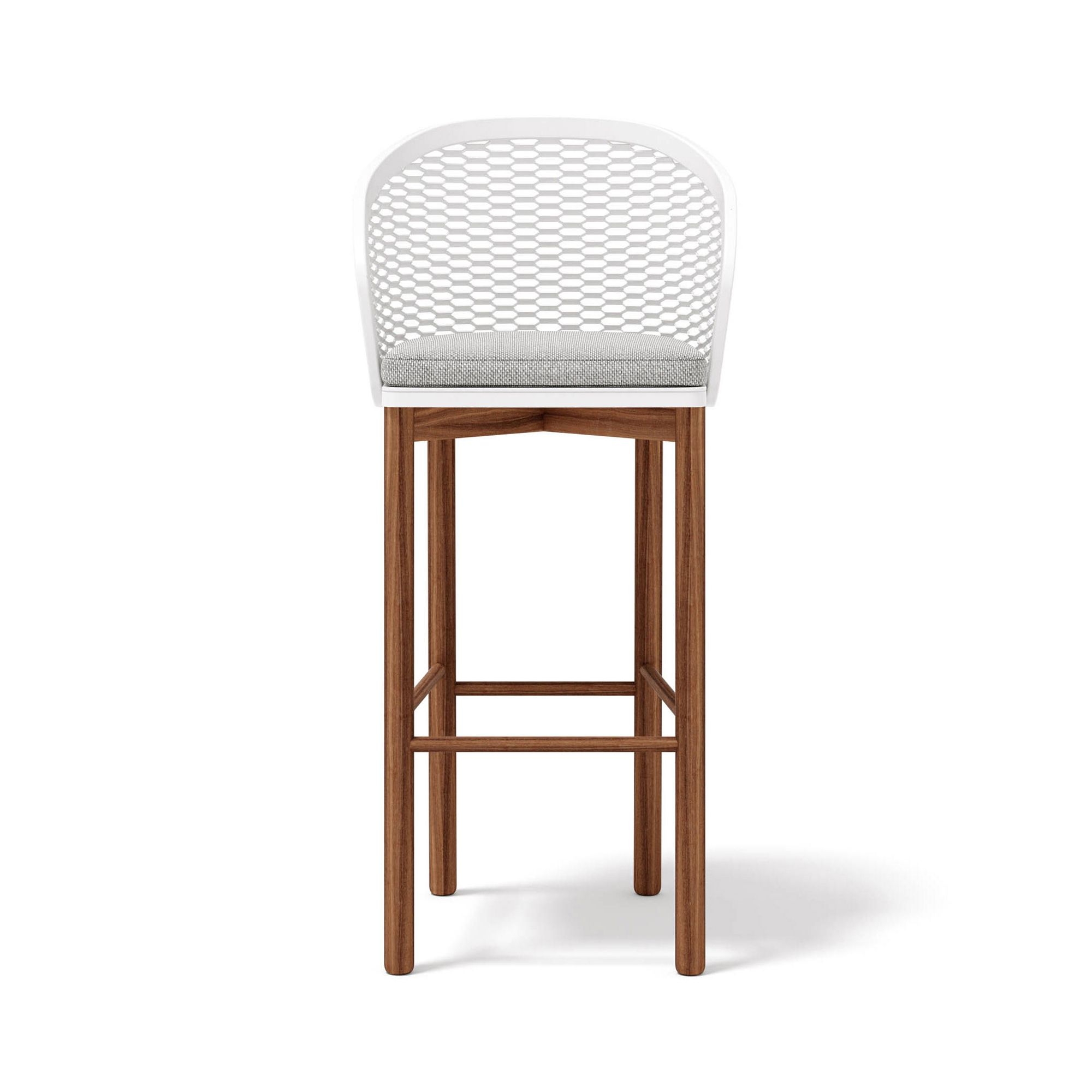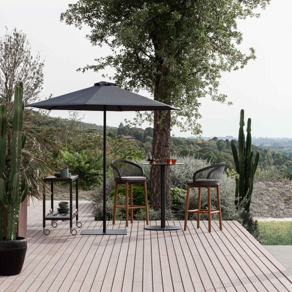 Sgabello da esterno Cyrano realizzato con scocca in alluminio, base in teak e cuscino della seduta rivestito in tessuto outdoor. Disponibile in una vasta combinazione di colori, lo sgabello outdoor Cyrano è un'elegante reinterpretazione dello stile e del comfort in chiave moderna ed concepito per arricchire con raffinatezza qualsiasi ambiente esterno. Caratterizzato da una robusta struttura in alluminio, che ne garantisce durabilità e resistenza alle varie condizioni atmosferiche, questo sgabello si distingue per il cuscino della seduta rivestito in un tessuto da esterno di alta qualità, assicurando il massimo del comfort anche in spazi aperti. Disponibile in una vasta gamma di combinazioni cromatiche, lo sgabello da esterno Cyrano è la fusione perfetta di opulenza e funzionalità, progettato per incontrare e superare le aspettative degli amanti del design più esigenti. Più che un semplice complemento d'arredo, questo sgabello rende omaggio all'esistenza avventurosa e romanticamente fervida di Cyrano de Bergerac, esprimendo un carattere audace e al contempo poetico. Con un design che esalta l'audacia di un nobile guerriero coniugata alla dolcezza di un poeta, lo sgabello da esterno Cyrano presenta dettagli eleganti e sofisticati, in una armoniosa convivenza tra sostanza materica e linee pulite ed accattivanti. La struttura in alluminio, avvolgente e sicura, è pensata per offrire un'isola di comfort, grazie anche a cuscini ergonomici progettati per garantire il massimo supporto e comodità durante il relax all'aria aperta. Disegnato da Atmosphera Creative Lab.