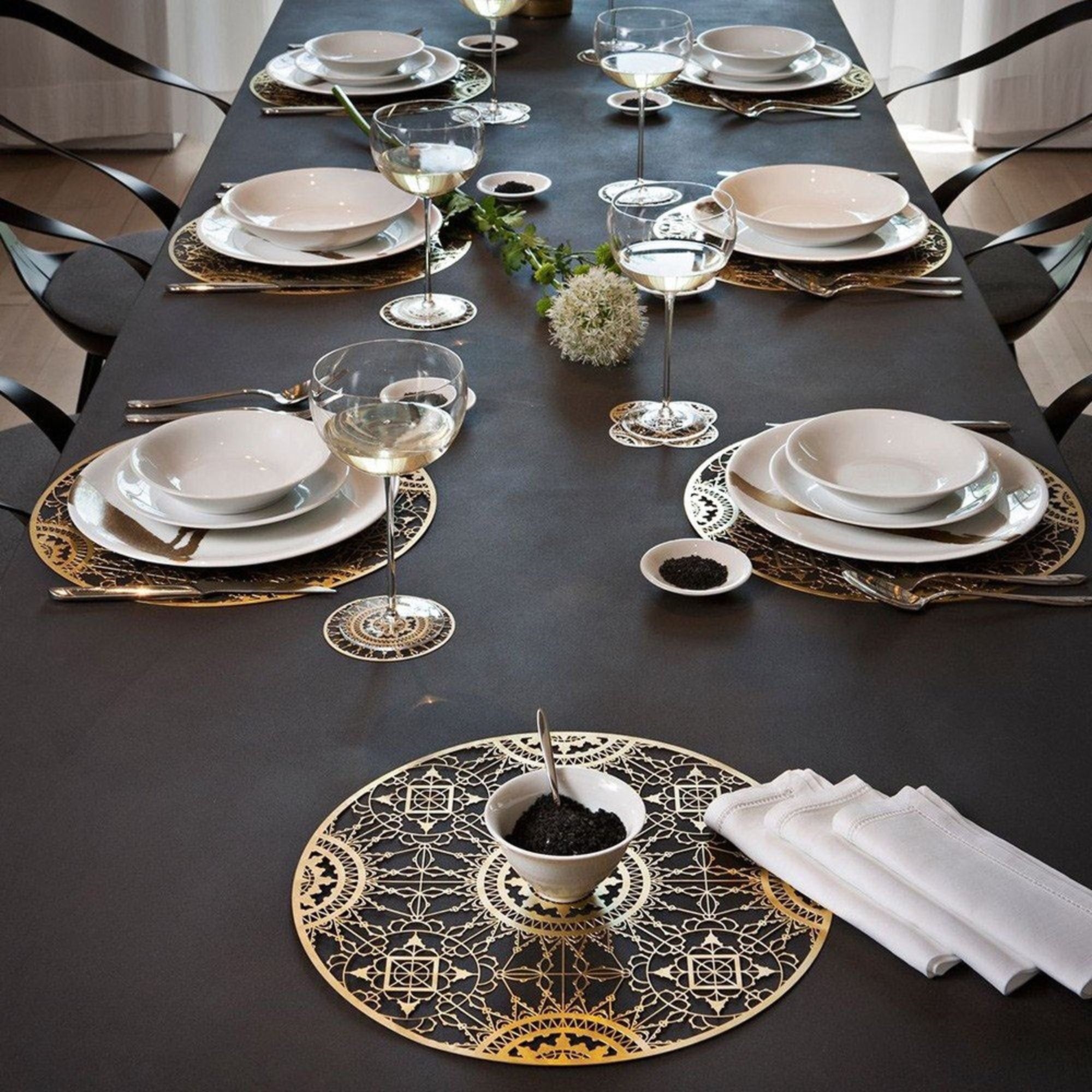 4 sottobicchieri Italic Lace realizzati in ottone. Disponibile in 3 eleganti finiture di colore, Italic Lace è un gruppo di sottobicchieri che si ispira allo stile del XV secolo a Siena, in cui venivano realizzati pizzi originali dalla straordinaria eleganza. Perfetti per coloro che vogliono vestire la tavola con un'eleganza mai scontata, i sottobicchieri Italic Lace raccontano in chiave contemporanea una visione antica. Disegnati da Maurizio Galante & Tal Lancman per Driade.