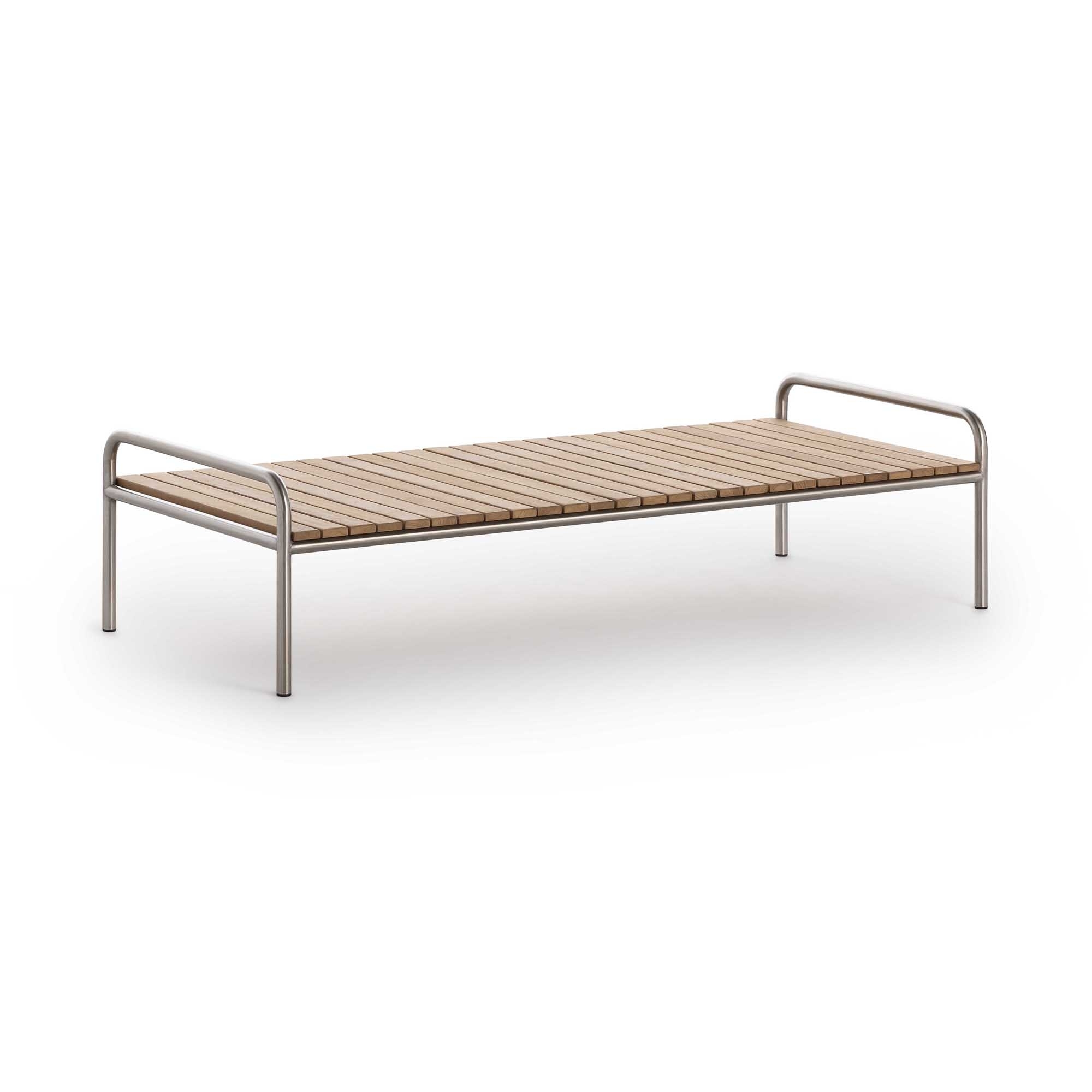 Tavolino Onsen Iroko 153x66 cm realizzato con struttura in acciaio inox AISI 316L satinato a basso contenuto di carbonio e resistente alla corrosione e all'ossidazione e piano in legno di Iroko naturale resistente agli sbalzi termici, all'acqua, all'umidità e all'uso frequente, con un design estremamente moderno, un'eleganza sempre attuale e perfetto per creare una zona lounge funzionale e lussuosa in giardino, in veranda o in un'area esterna di un resort o bistrot. Disegnato da Francesco Meda e David Quincoces per Gandía Blasco.