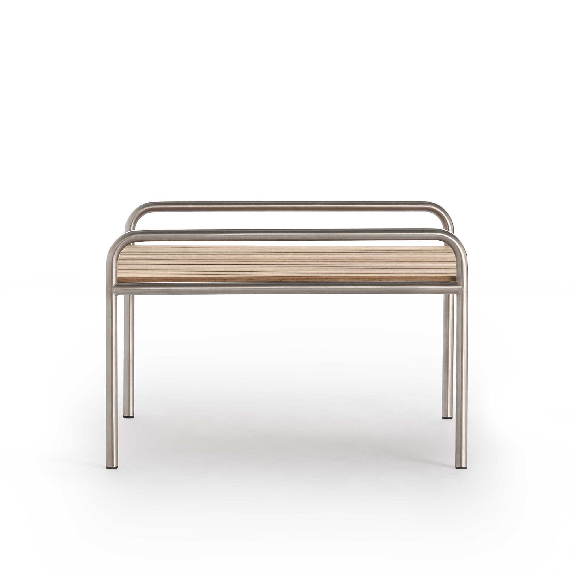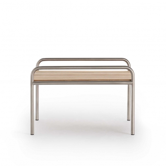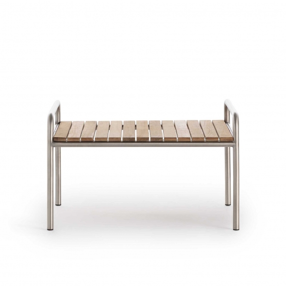 Tavolino Onsen Iroko 76x76 cm realizzato con struttura in acciaio inox AISI 316L satinato a basso contenuto di carbonio e resistente alla corrosione e all'ossidazione e piano in legno di Iroko naturale resistente agli sbalzi termici, all'acqua, all'umidità e all'uso frequente, con un design estremamente moderno, un'eleganza sempre attuale e perfetto per creare una zona lounge funzionale e lussuosa in giardino, in veranda o in un'area esterna di un resort o bistrot. Disegnato da Francesco Meda e David Quincoces per Gandía Blasco.