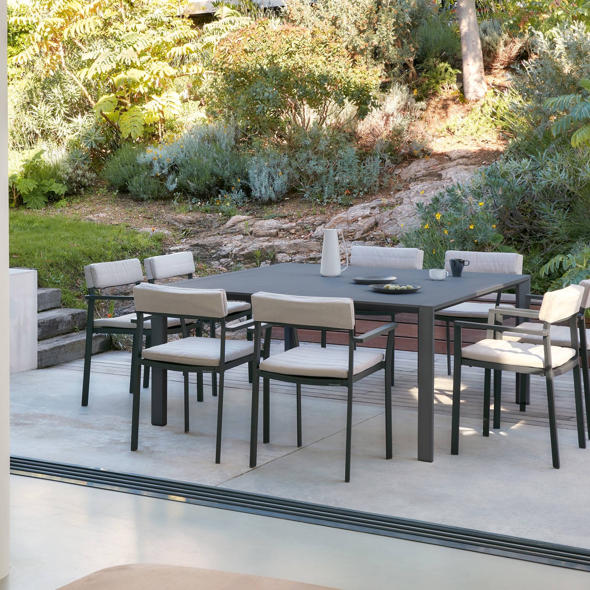 Tavolo Metris, 160x160 cm, è un'opera d'arte realizzata da Diphano per la collezione Metris, interamente in alluminio verniciato in polvere di altissma qualità che promette robustezza e resistenza ai vari agenti atmosferici come raggi UV, pioggia e umidità, perfetto per l'uso esterno. Disponibile in due bellissime combinazioni, il tavolo da pranzo Metris si abbina armoniosamente in ambienti con più stili e decori, sia che lo si scelga per il proprio giardino moderno, per un patio minimalista o una terrazza più classica. La superficie del tavolo 160x160 cm assicura posti per otto persone, rendendolo ideale per cene e serate in famiglia o feste con gli amici. Inoltre, la forma quadrata promuove la conversazione, permettendo a tutti gli ospiti di interagire visivamente con facilità. Le doghe del tavolo Metris sono realizzate in alluminio e facilitano la manutenzione e la pulizia. Il tavolo Metris 160x160 cm è più di un semplice pezzo di arredamento, è una vera e propria dichiarazione di stile, funzionalità e innovazione senza eguali.