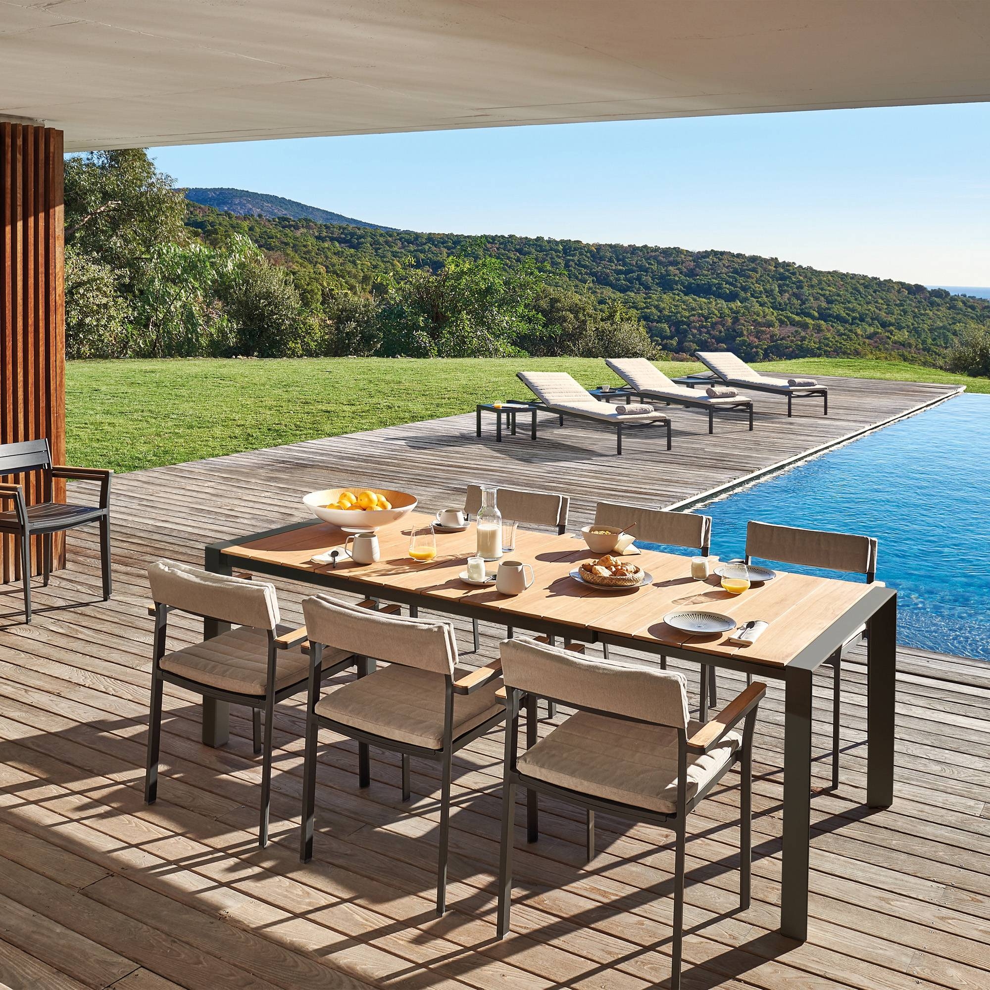Tavolo allungabile Alexa, 220-280x96 h 75, è stato realizzato con materiali di alta qualità, tipico di Diphano, quali alluminio robusto e durevole nel tempo e il pregiatissimo legno Teak che assicura resistenza ai vari agenti atmosferici quali pioggia, raggi UV e umidità. Questo magnifico tavolo outdoor è disponibile in due bellissime colorazioni, quindi è abbinabile con qualsiasi tipo di arredamento esterno: può essere posizionato all'interno di un terrazzo dallo stile minimalista, o in giardino accanto la piscina moderna e all'avanguardia. Il tavolo Alexa ha la particolarità: con uno sforzo minimo, questo tavolo da pranzo per otto perone, si trasforma in un tavolo per dieci persone, quindi da 220 cm a 280 cm. La facilità di manutenzione è un altro punto di forza del tavolo allungabile Alexa; è sufficiente una semplice pulizia con detergente neutro e acqua per mantenere inalterato nel tempo il suo bellissimo aspetto estetico. Sinteticamente, se cerchi un tavolo allungabile che unisca bellezza, funzionalità e innovazione, il tavolo allungabile Alexa è fatto per te.