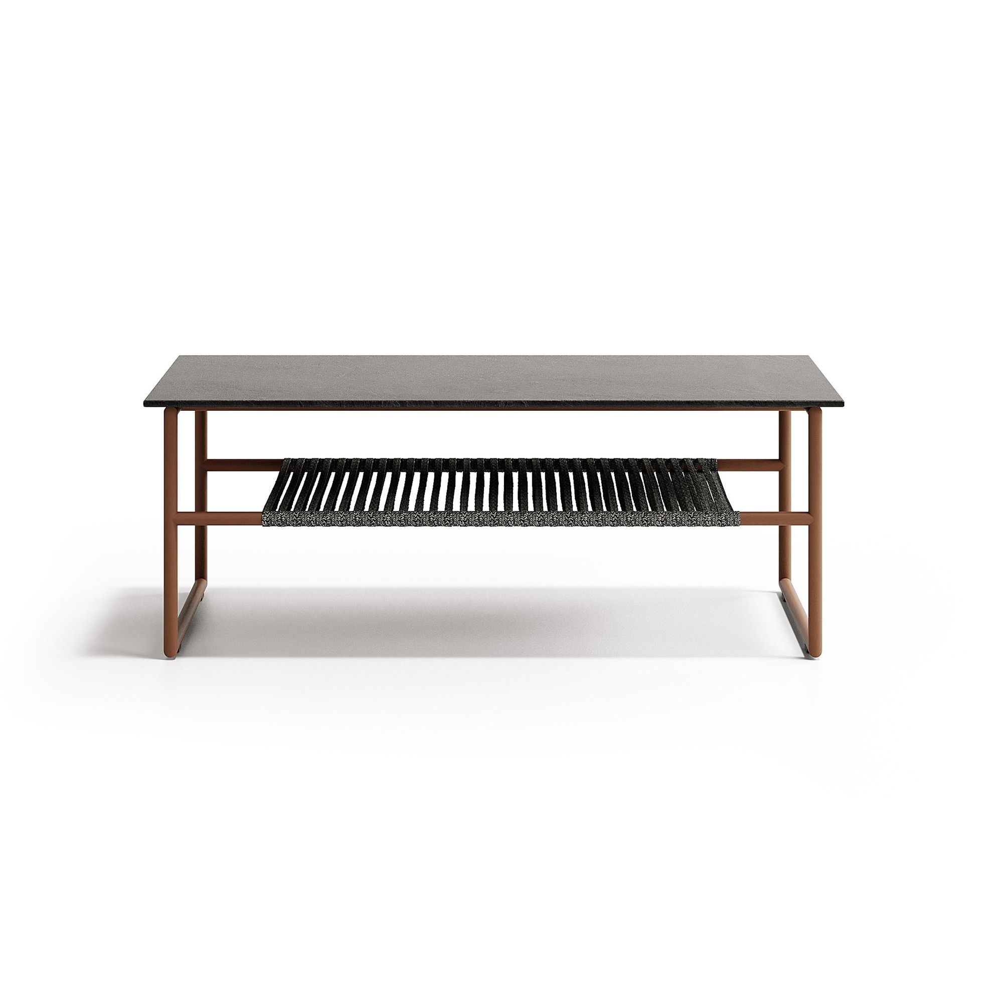 Tavolo basso da esterno Pipe 102x68x35h cm realizzato con struttura in acciaio verniciato terracotta, piano inferiore in corda grigia intrecciata a mano e top in gres Noir Beige. Questo pezzo unico si integra perfettamente in qualsiasi ambiente esterno, da giardini moderni a terrazze urbane, grazie al suo design distintivo che combina estetica e funzionalità. Realizzato con materiali di alta qualità selezionati per garantire durabilità e resistenza agli agenti atmosferici, il tavolo basso Pipe è ideale per completare l'arredo di spazi all'aperto, aggiungendo un tocco di eleganza e comfort. La sua superficie robusta e le sue linee pulite lo rendono estremamente versatile, capace di adattarsi sia a contesti informali che a setting più raffinati, mentre la sua struttura resistente assicura che mantenga la sua bellezza nel tempo. La collezione Pipe, con il suo tavolo basso da esterno, rappresenta la scelta ideale per chi cerca un arredo esterno di design, capace di combinare forma e funzione in modo impeccabile. Che sia per rilassarsi al sole o per intrattenere gli ospiti, il tavolo basso Pipe aggiunge un elemento di stile inconfondibile al tuo spazio esterno, rendendolo unico e accogliente. Disegnato da Busetti Garuti Redaelli per Atmosphera.