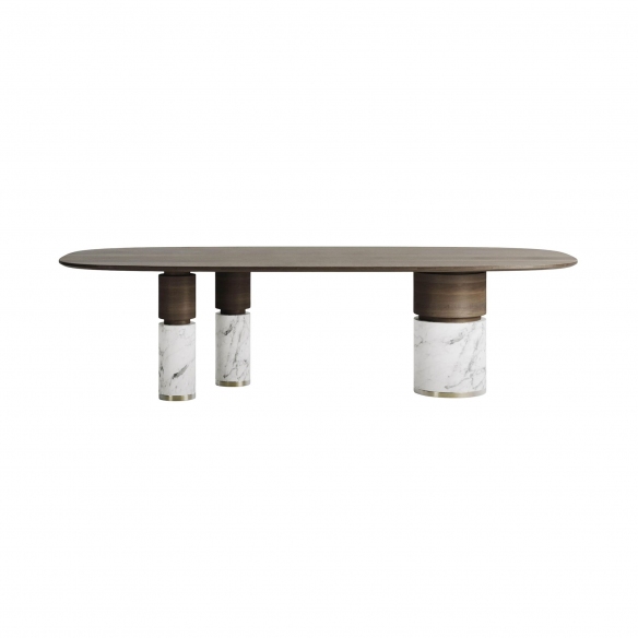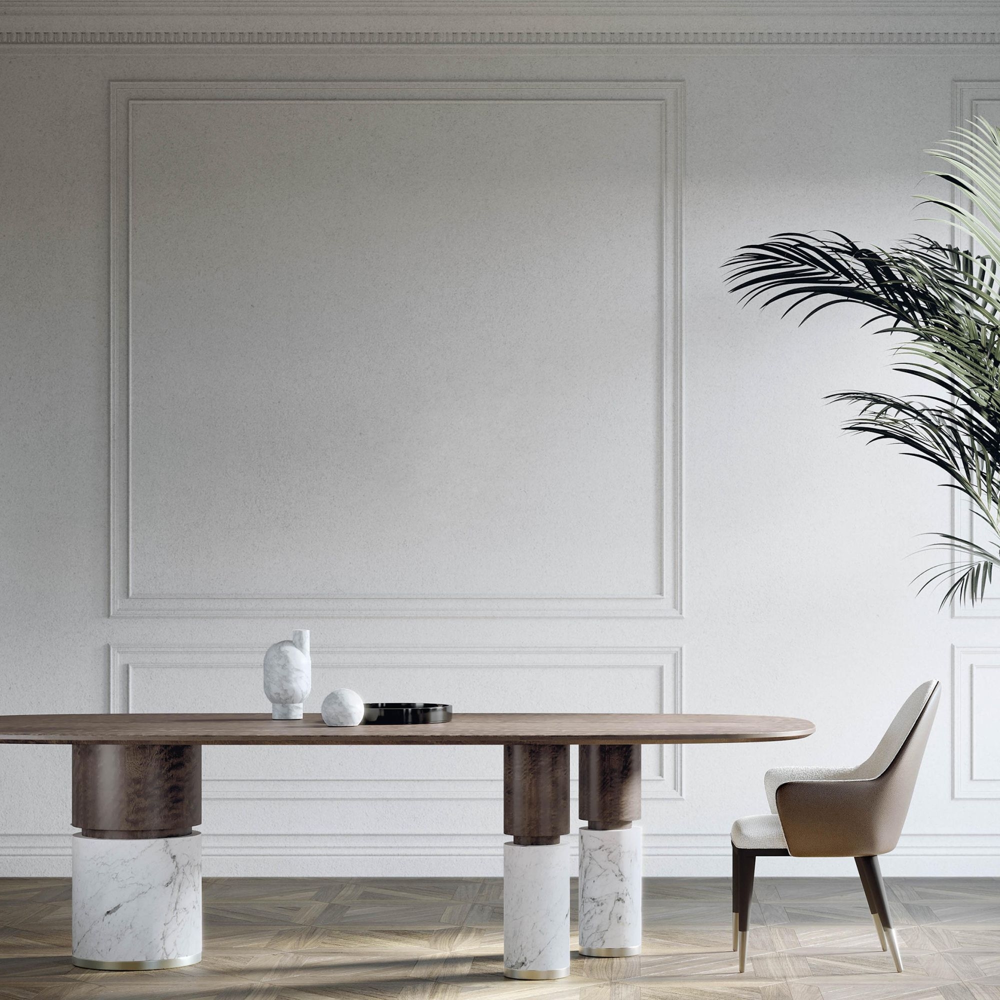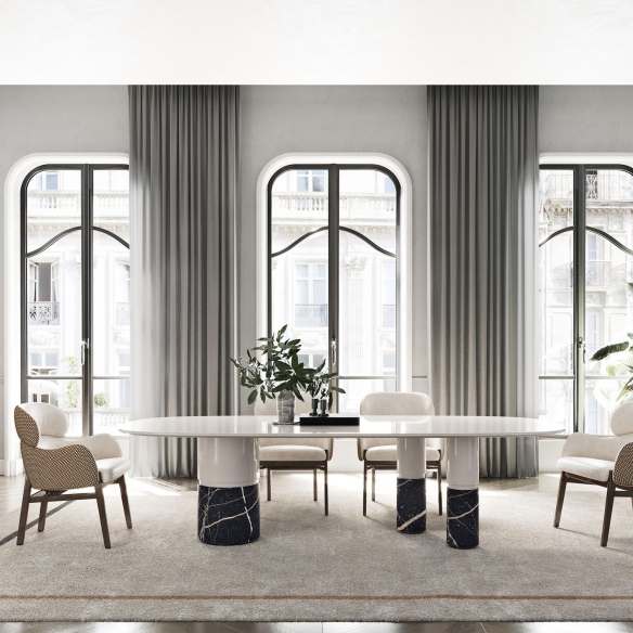 Il tavolo ovale Loïc è un elegante pezzo di arredamento realizzato da Capital con gambe bimateriche caraterizzate da una prima parte in laccato o essenza lucida o opaca e da una seconda parte in marmo e dettagli in finitura metallica, materiali che conferiscono un'eleganza senza tempo e una notevole resistenza. Questo tavolo è caratterizzato da un design elegante e possente, e grazie alla sua palette di colori può essere facilmente integrato a qualsiasi ambientazione e tipologia di arredamento: che sia collocato all'ingresso di una casa, in salotto, oppure in uno studio professionale, Loïc non è solo un pezzo di mobilia, ma un vero e proprio oggetto di stile che riflette la personalità e il gusto del proprietario. Inoltre, il tavolo offre non solo un ampio spazio per ospitare comodamente fino a dieci persone ma anche un'immagine maestosa di design e artigianalità. Il suo ampio spazio centrale invita alla conversazione e condivisione, rendendolo ideale per cene, riunioni di famiglia o incontri di lavoro. Design di Boatto Martino Studio.
