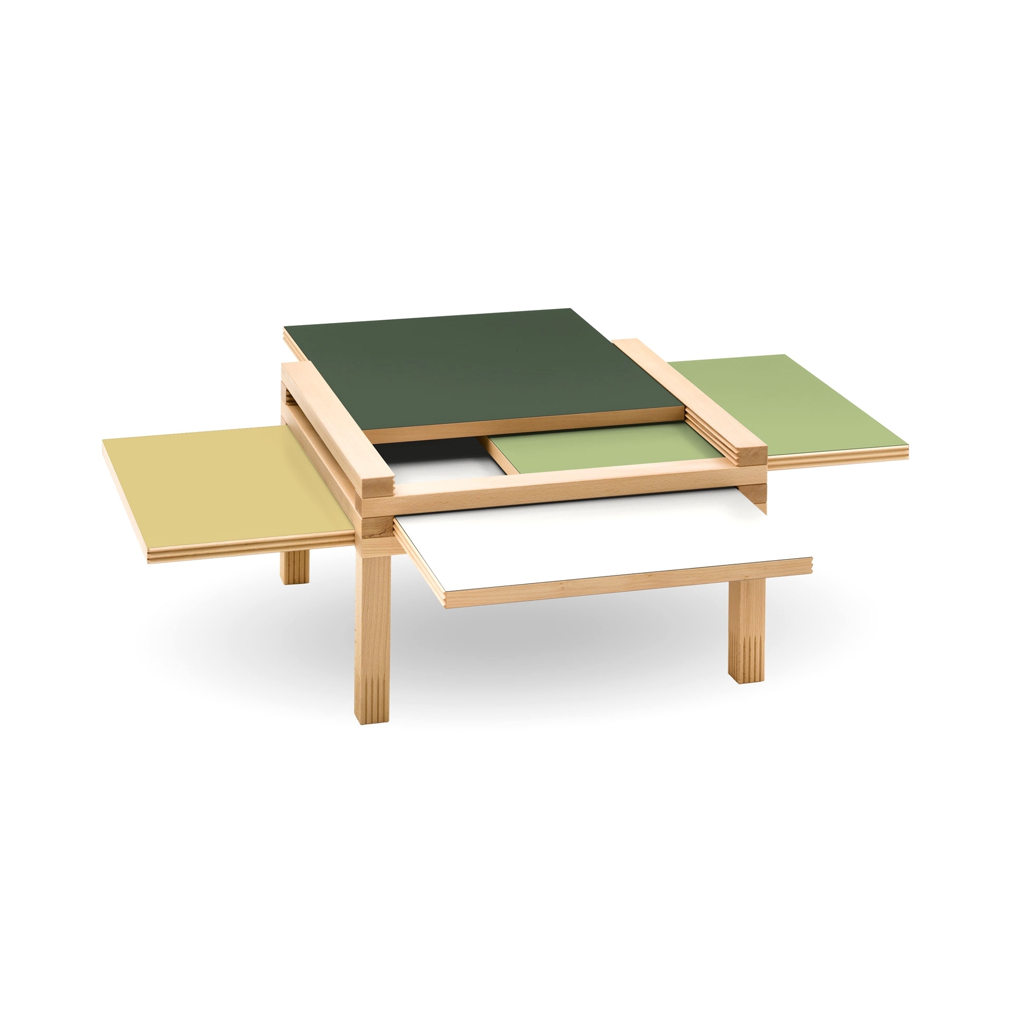 Tavolino Par4 realizzato con struttura in rovere e 4 piani in laminato da un lato e in tranciato (legno) dall'altro. Disponibile in 9 diverse combinazioni di colore, il tavolino Par4 dispone di quattro piani estraibili e reversibili, da usare come vassoi o semplicemente come superfici d'appoggio. Par4 è un tavolino particolare e inusuale, è l'ideale per chi vuole aggiungere un pò di creatività al proprio ambiente. Disegnato da Bernard Vuarnesson per Sculptures Jeux.