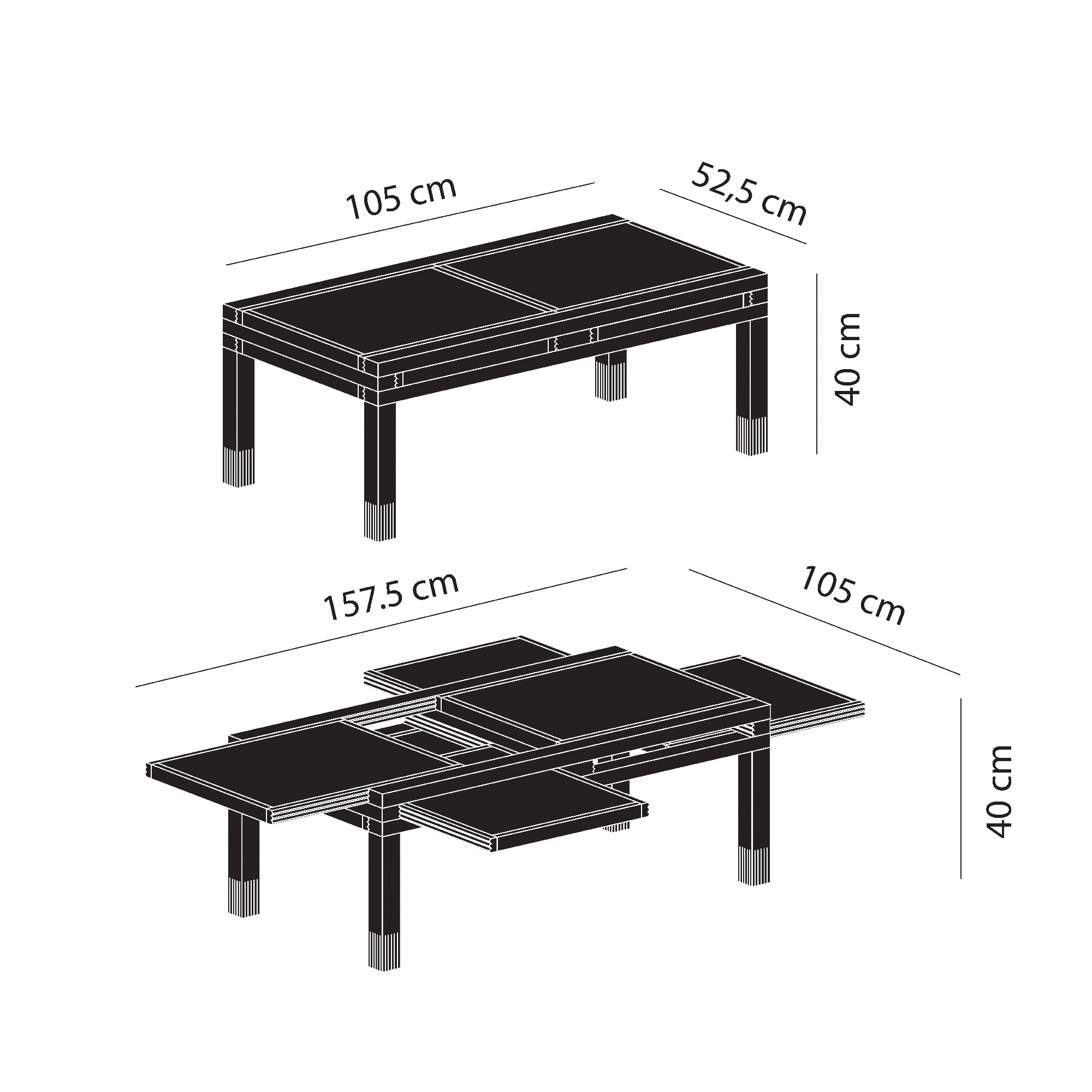 Dimensioni: Chiuso: Lunghezza 105 cm, Larghezza 52.5 cm, Altezza 40 cm; Aperto: Lunghezza 157.5 cm, Larghezza 105 cm, Altezza 40 cm