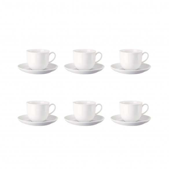 6 tazzine da caffè con piattini Form 1382 Weiss realizzate in porcellana bianca di alta qualità. Versatili per natura, queste tazzine con piattini sono perfette per ogni tipo di arredamento, da quello moderno a quello più classico, fondendosi senza sforzo con altri pezzi di stoviglie. Sia che tu stia ospitando una colazione informale o una cena elegante, questo set è progettato per impressionare. La capacità delle tazzine è perfettamente calibrata per assaporare il vero gusto del caffè, mentre i piattini offrono lo spazio adeguato per accompagnamenti dolci o salati, migliorando l'esperienza di degustazione. La robustezza della porcellana garantisce inoltre che questo set possa essere utilizzato quotidianamente, combinando durata ed estetica. Realizzate in pregiata porcellana bianca che ha reso famoso il marchio Rosenthal, queste tazzine da caffè e i loro piattini si distinguono per l'essenzialità delle forme e la loro impeccabile finitura bianca, convertendosi in un classico intramontabile adatto a ogni occasione.