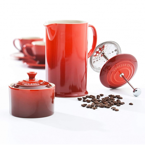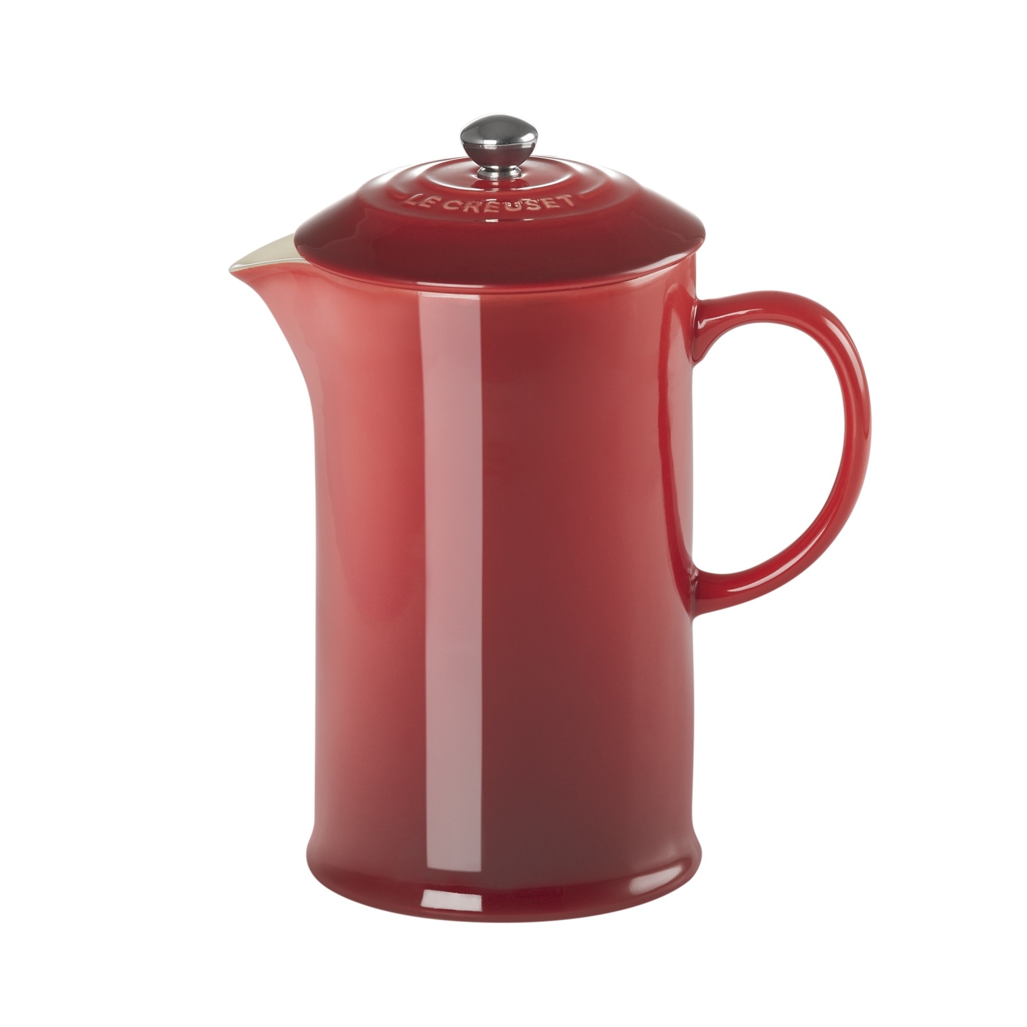 Coffee press realizzata in gres vetrificato smaltato all'esterno. Disponibile in 6 finiture di colore (arancio, ciliegia, mist grey, blu marsiglia, shell pink e meringue) è perfetta per gustare un delizioso caffè anche in compagnia, grazie alla generosa capacità di 1 litro. La robusta superficie in gres vetrificato e il pomolo in acciaio inox rendono questa caffettiera molto resistente e duratura nel tempo. Design inconfondibile di Le Creuset con il motivo a 3 anelli sulla superficie del coperchio fanno di questa caffettiera un oggetto davvero unico nel suo genere!