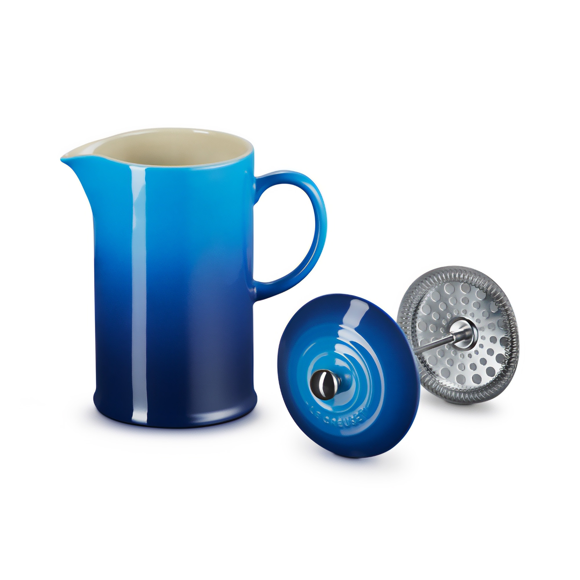 Coffee press realizzata in gres vetrificato smaltato all'esterno. Disponibile in 6 finiture di colore (arancio, ciliegia, mist grey, blu marsiglia, shell pink e meringue) è perfetta per gustare un delizioso caffè anche in compagnia, grazie alla generosa capacità di 1 litro. La robusta superficie in gres vetrificato e il pomolo in acciaio inox rendono questa caffettiera molto resistente e duratura nel tempo. Design inconfondibile di Le Creuset con il motivo a 3 anelli sulla superficie del coperchio fanno di questa caffettiera un oggetto davvero unico nel suo genere!