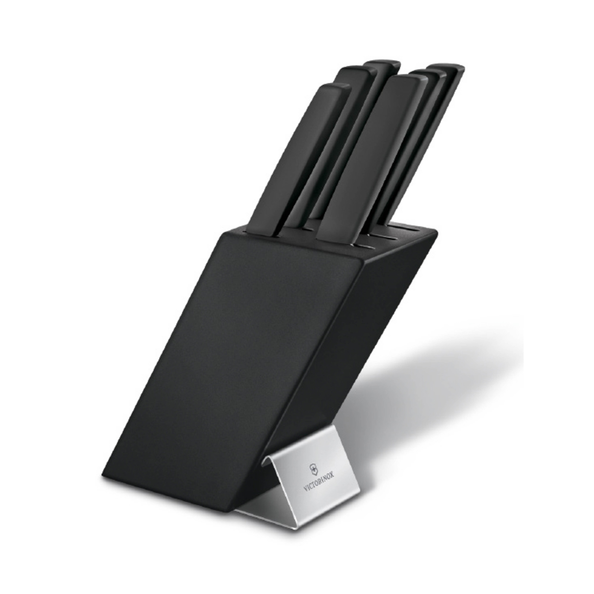 Ceppo con 6 coltelli Swiss Modern realizzato in legno di faggio laccato nero con supporto in acciaio inox. Il set comprende: