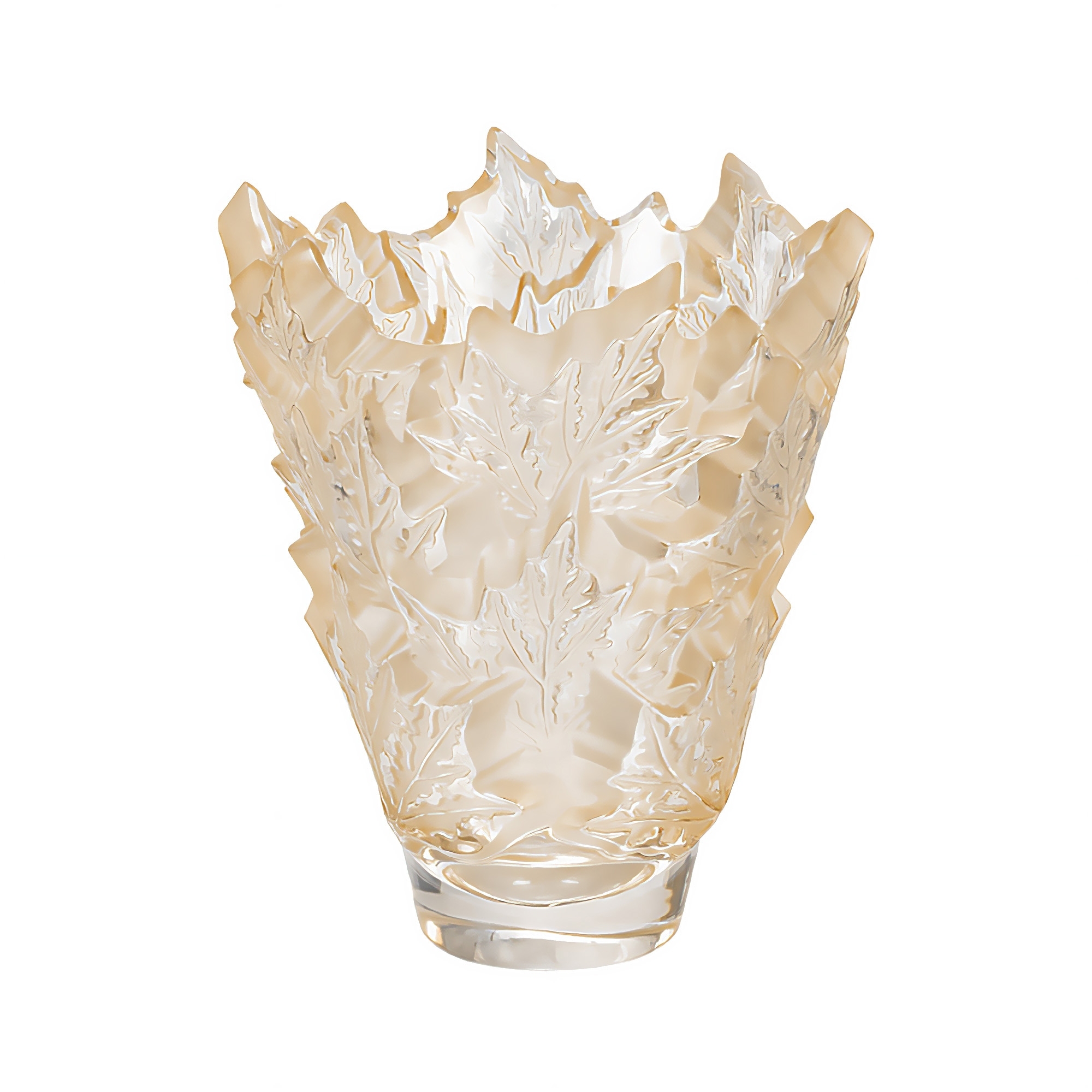 Vaso della collezione Champs Élysées finitura "Lustré Or" realizzato in cristallo. Elegante e raffinato, il vaso Champs Élysées rappresenta delle foglie di cristallo finemente rigate, che evocano le alberate di platani che costeggiano i Champs Élysées. Un'opera d'arte in cristallo in grado di trasmettere valori artistici e decorativi in qualsiasi ambiente. Disegnato da Marc Lalique.