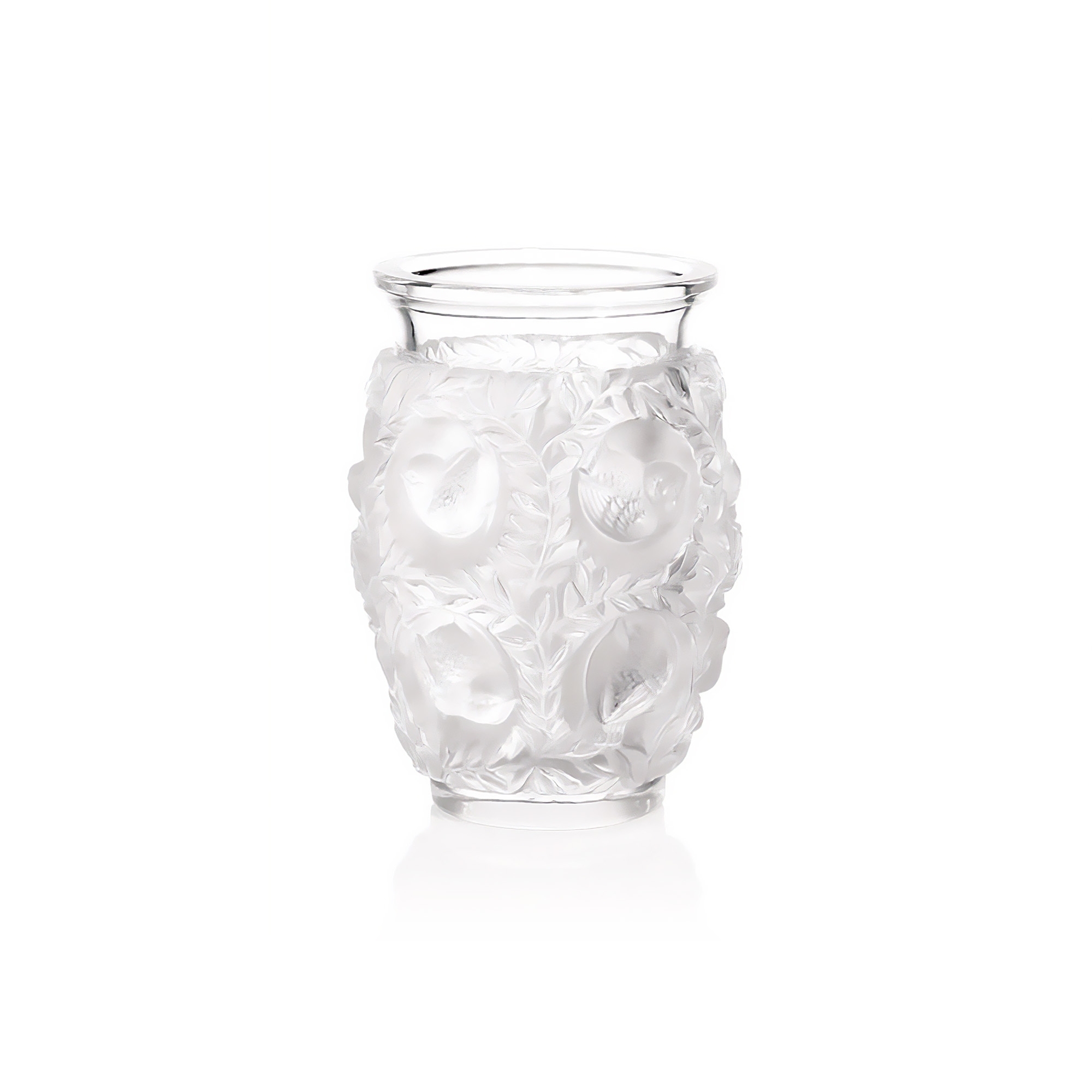 Vaso Bagatelle realizzato in cristallo. Disegnato per la prima volta nel 1939, questo classico della collezione esibisce un'estetica naturalistica, combinando elementi di fauna e flora. Il vaso Bagatelle ci catapulta in una natura onirica, rispondendo alle aspirazioni di autenticità e benessere. Realizzato da Lalique.