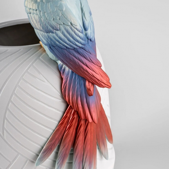Il vaso Cacatua è un delicato pezzo artistico realizzato da Lladró in porcellana bianca con scultura di cacatua dipinta a mano. Questo splendido vaso cattura l'essenza della natura e della sua fauna con un cacatua australiano, bellissimo e regale uccello con una cresta affascinante. L'opera è impreziosita da sfumature graduali di blu e rosso, mentre la finitura iridescente impreziosisce la testa e il corpo dell'uccello, con accenti di oro opaco e lucido sulle zampe e sul becco. Il cacatua siede elegantemente sul bordo di un semplice vaso bianco con intagli geometrici, creando un forte contrasto con il suo colore brillante. Questo vaso è un'espressione decorativa ideale sia come contenitore per fiori che come oggetto d'arte in sé, adatto a vari stili di arredamento e per arricchire qualsiasi ambiente domestico con un tocco di fascino naturale: dal salotto alla camera da letto, dall'ufficio alla cucina. Disegnato da José Santaeulalia per Lladró.